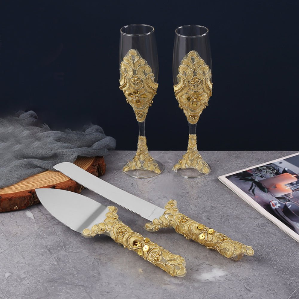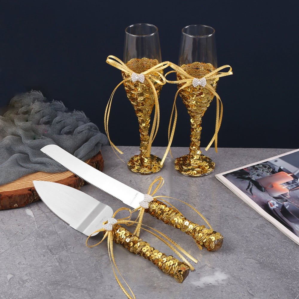 Elevate your wedding celebration with our Wedding Wine Glasses and Cake Cutting Set, designed to add elegance and sparkle to your big day. Featuring stunning gold sequin details, this set perfectly complements your wedding theme and creates a touch of timeless sophistication.