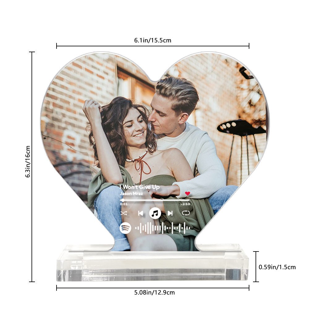 Celebrate love with a custom photo music code acrylic plaque, featuring a heart-shaped design and scannable music code.