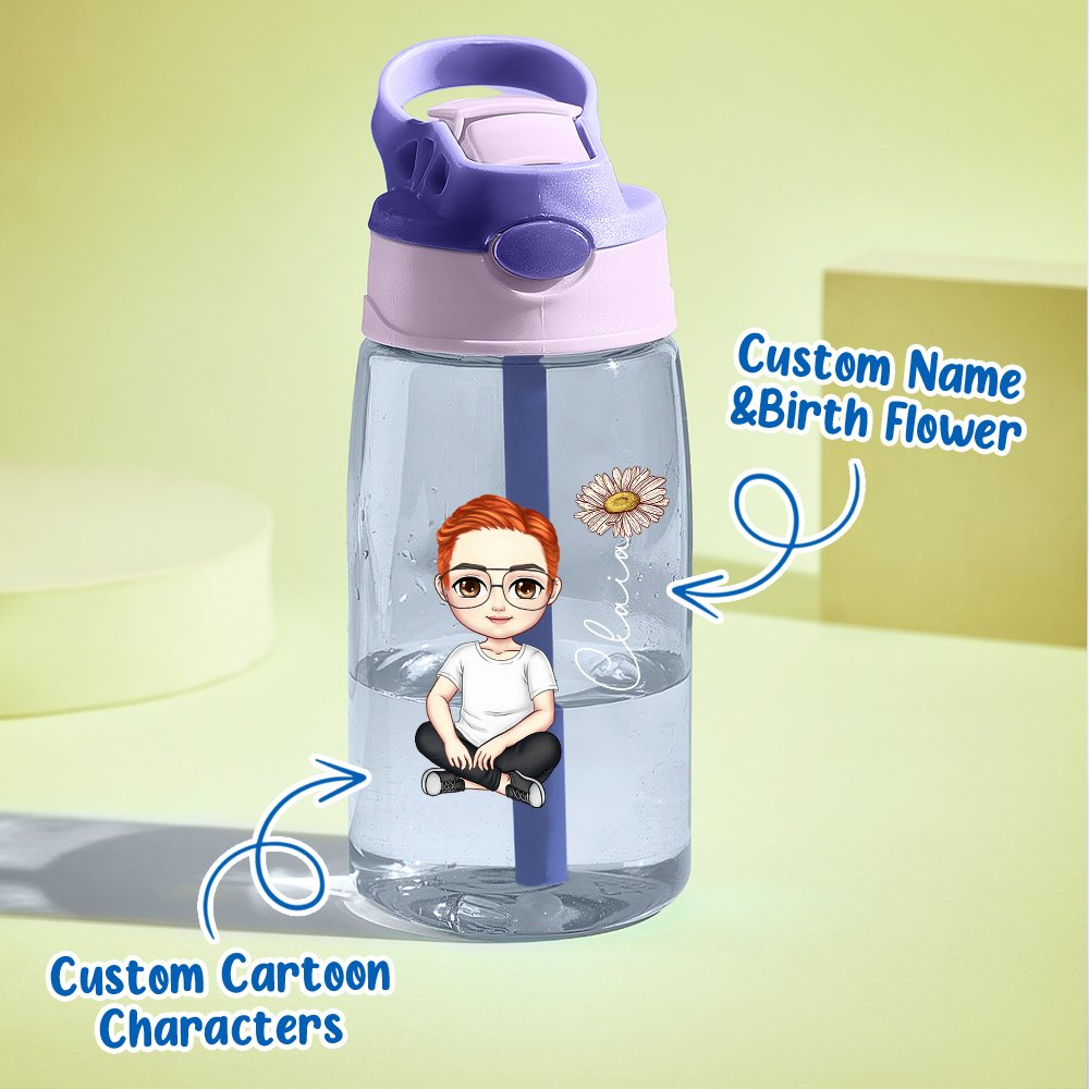 Personalised Cartoon Water Bottle | Birth Flower 16oz Gift