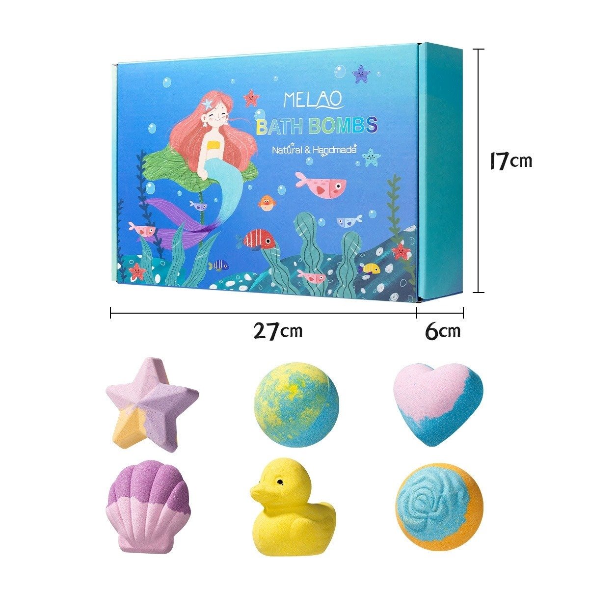 Colorful bath bombs in various shades with a box labeled 'Bath Bomb Gift,' alongside cute ocean-themed animal figures like fish, turtles, and sharks